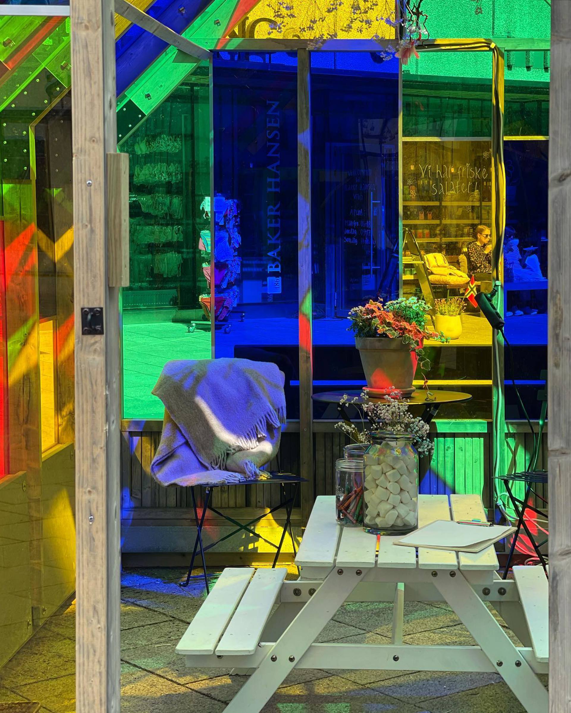 Plexon har levert fargede plexiglass plater til dette drivhuset eller oasen. Zenisk står bak ideen til denne glade og publikumsvennlige hvileplassen.