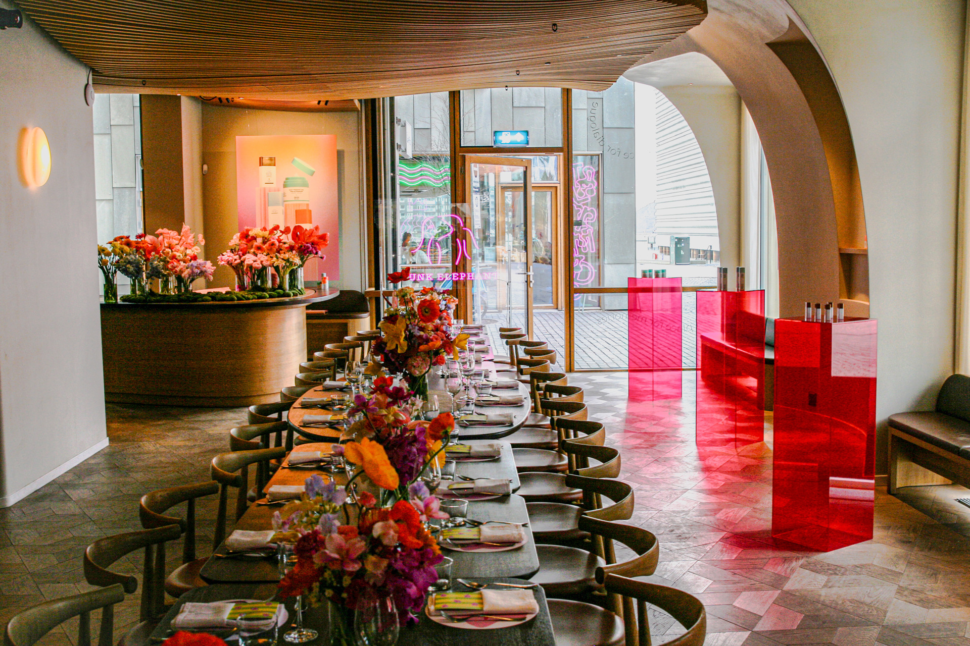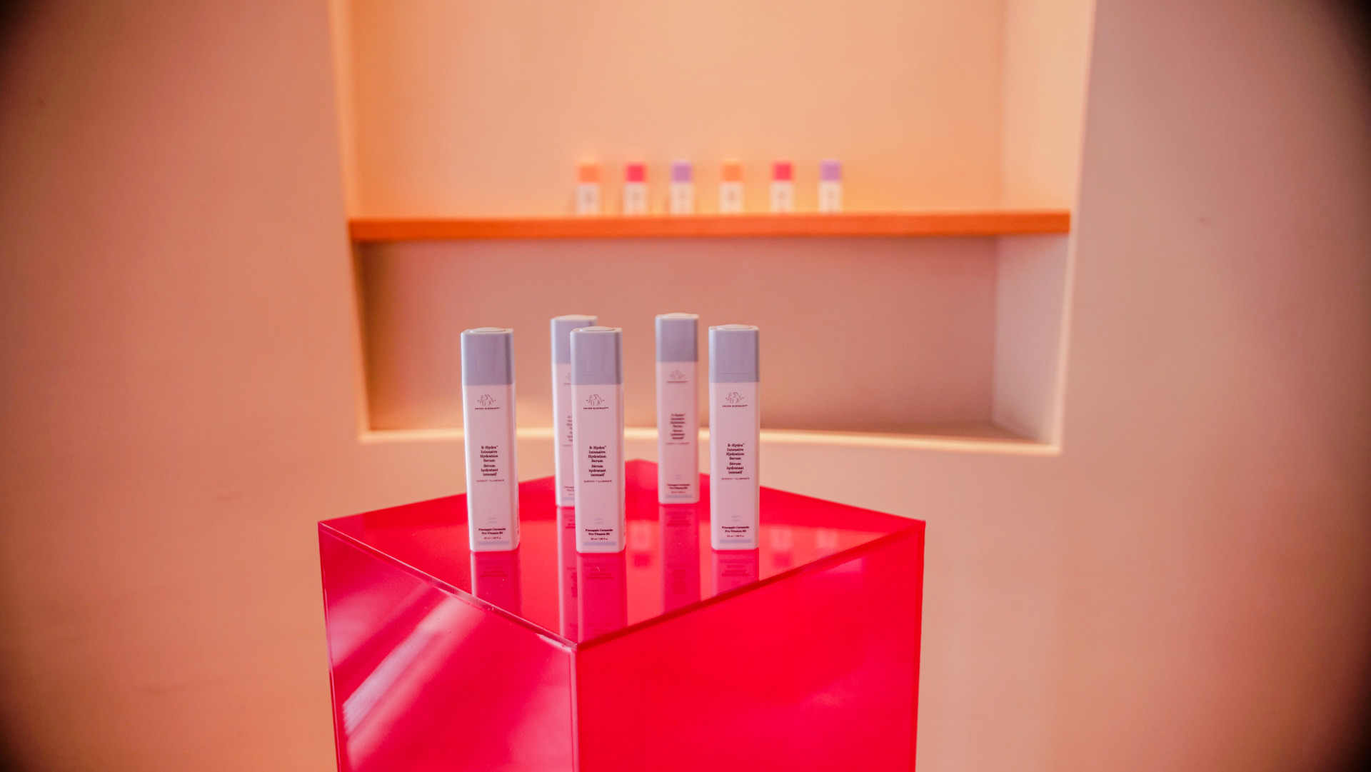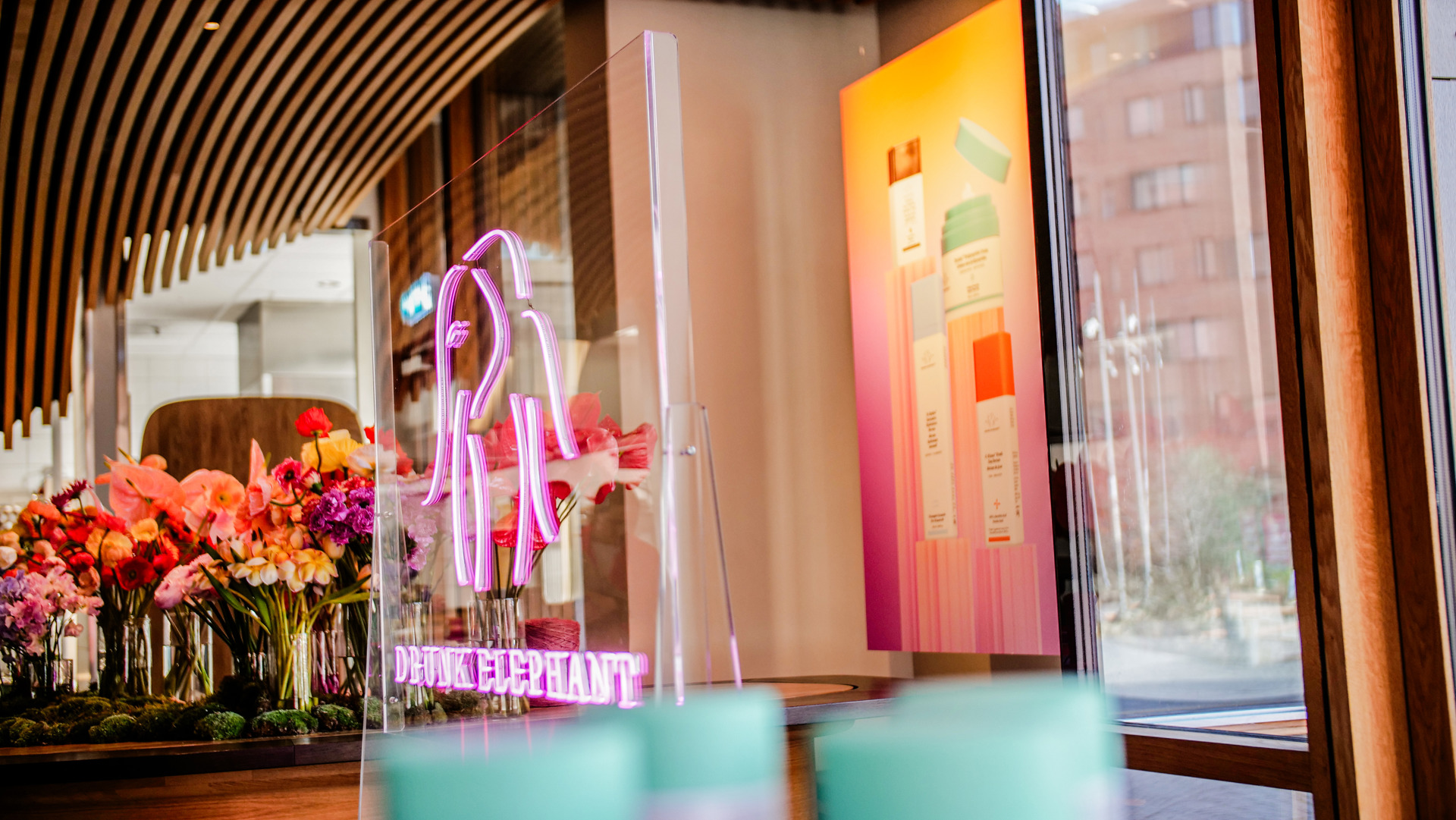 Rosa podier og neonskilt som "svever" til prisvinnende hudpleieserie