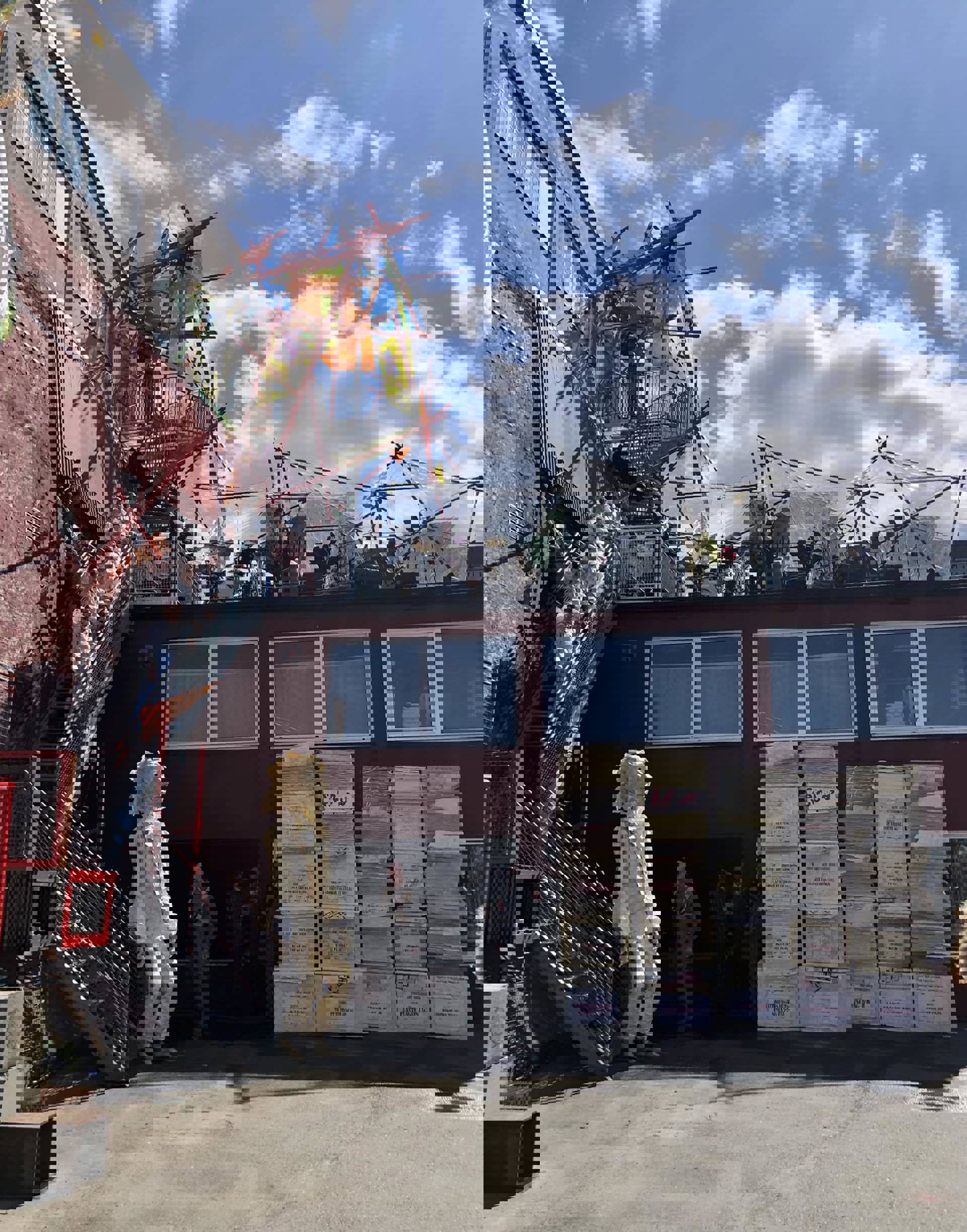 Til Cirka Teaters jubileumsforestilling «Trappa» fikk fasaden på Nyhavna et helt nytt blikkfang: En leken, fargerik rømningstrapp med et halvt naust – eller kanskje et lekehus – på toppen, som ser ut til å ramle nedover i en kaskade av rare og vakre elementer.